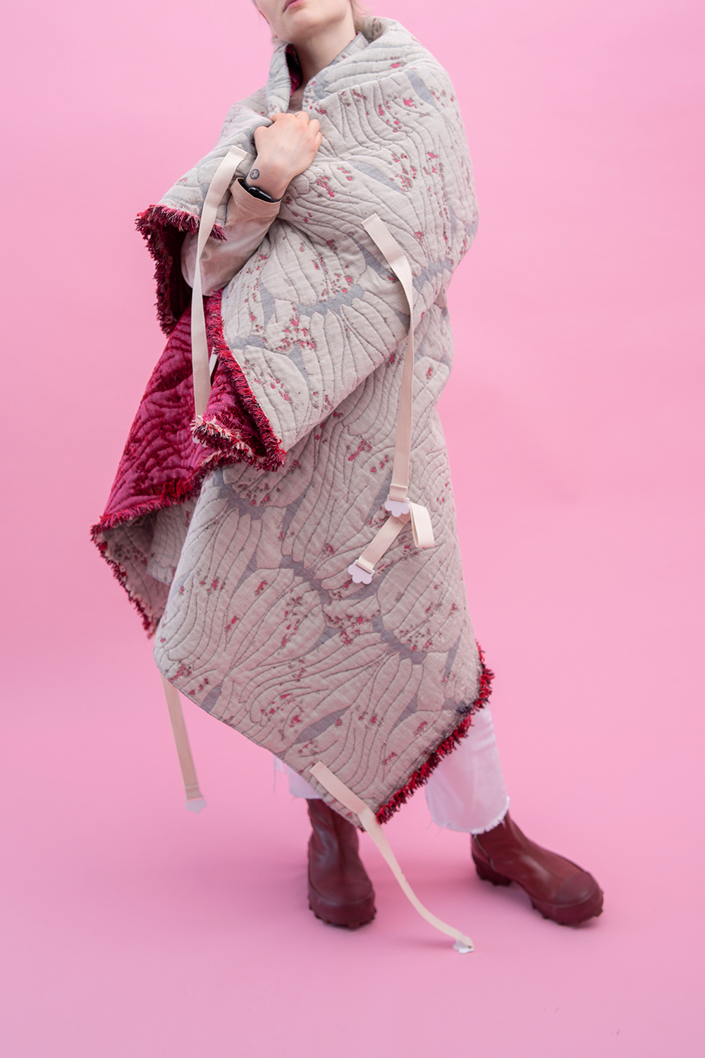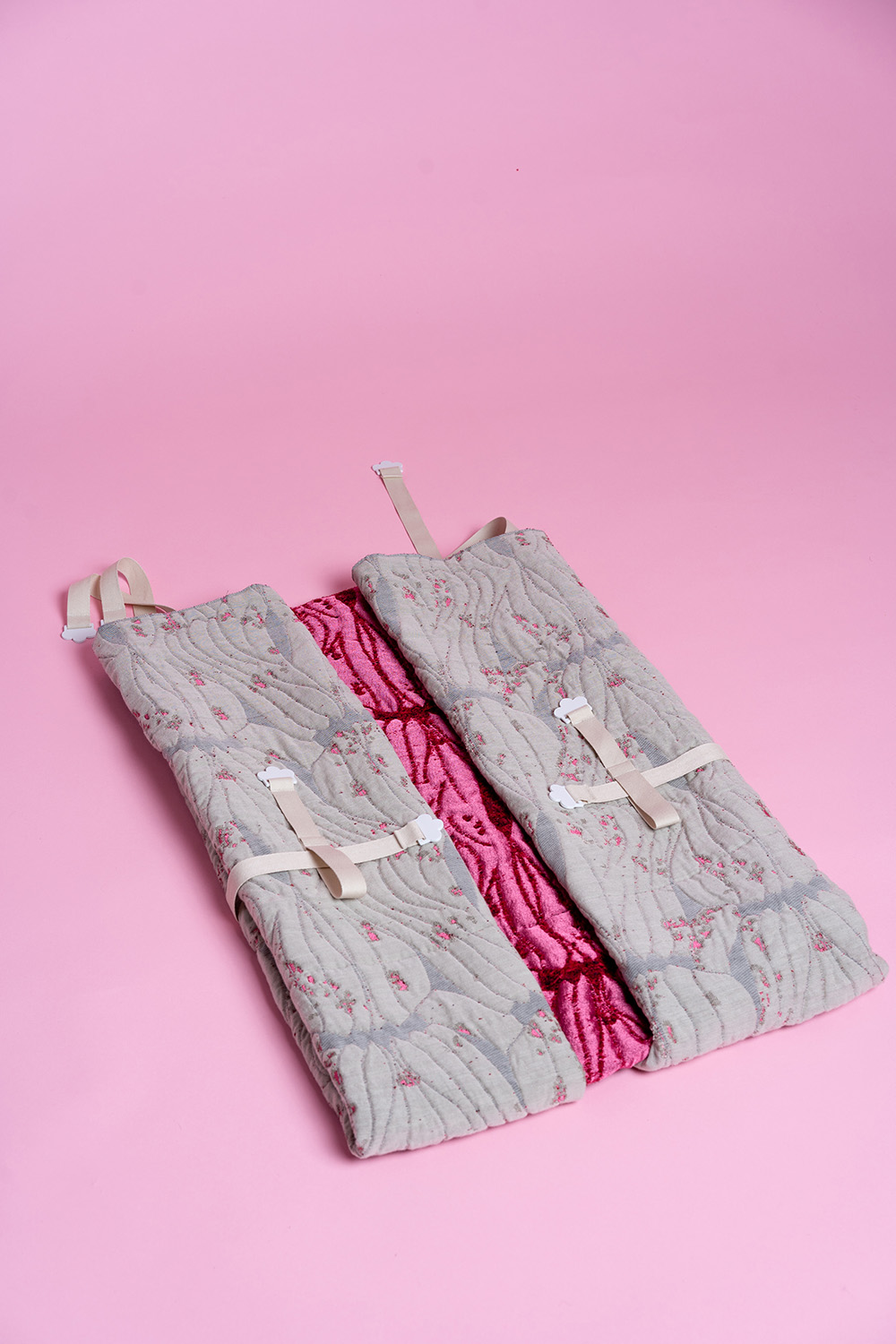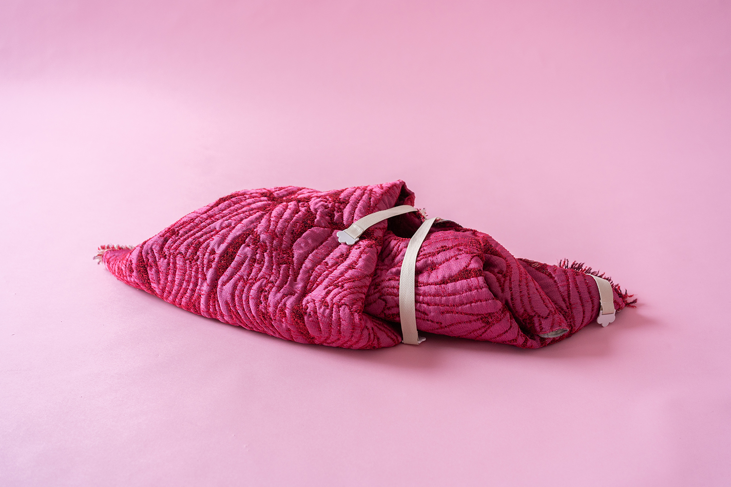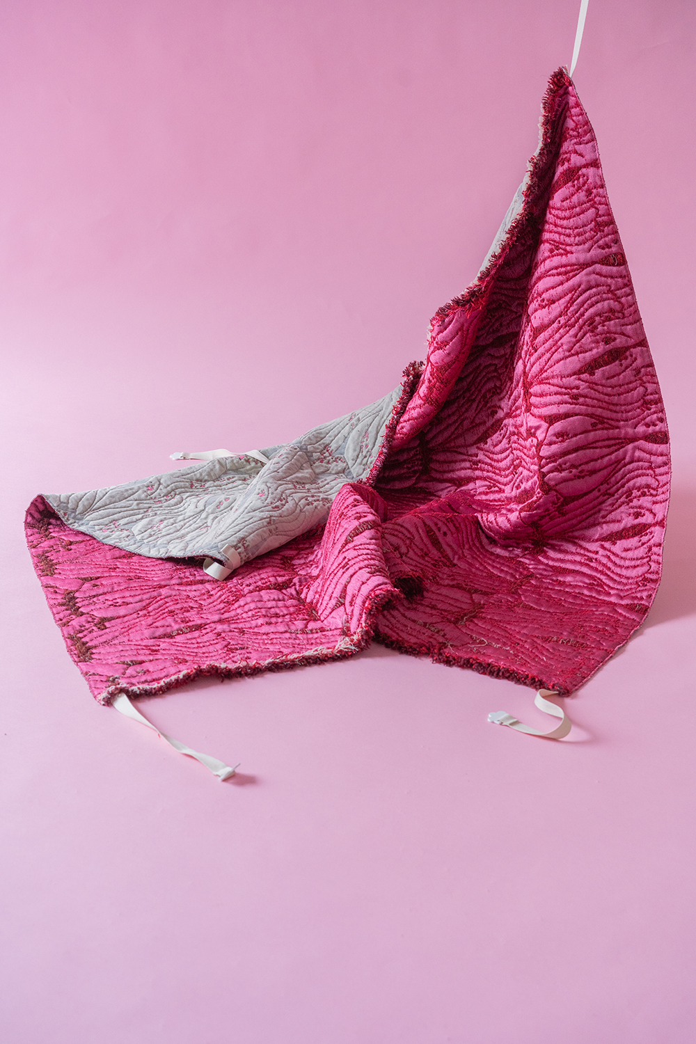 Roadkill fetches its name from the double-sided design with fleshy pink backside and flowery limb and scar-tissue pattern. The soft and warm sculpture features cotton straps enabling different kind of foldings. The white strap-ends are 3d-printed with white PETG-filament.